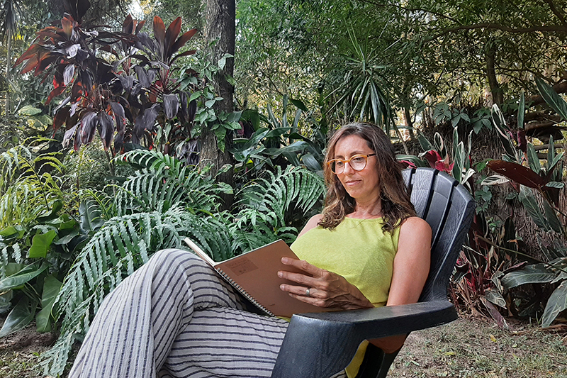 Avancé en la escritura, moví párrafos de lugar, fui de la pantalla al papel y del papel a la pantalla y pude encontrar la concentración y la tranquilidad que buscaba para imaginar nuevas formas de presentar ideas y exploraciones de lenguajes que desconozco casi por completo… ¿un nuevo idioma? Nadé en la pileta sin pensar tanto y también pensé en el borde del agua mirando los árboles del parque. Me dejé inundar por los colores de la casa, del agua, de las plantas, de la tierra. Tomé notas en mi cuaderno, llevé un diario que escribí cada noche, escuché música, conversé y también estuve en silencio. Disfruté de las charlas con Maxi, con Pilar y con Cintia (y de sus exquisitas comidas caseras). Conocí Rincón, el río Ubajay, los alrededores de la casa. El ritmo se desaceleró, el tiempo cambió de andarivel, las prioridades se reacomodaron.