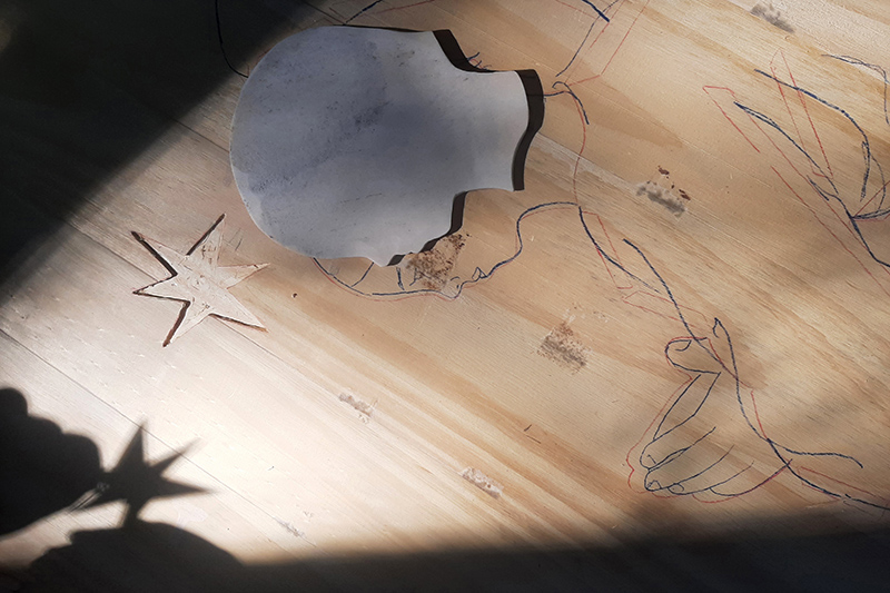 Durante las dos semanas de residencia, seleccioné, corté, lije y pulí pequeños fragmentos de huesos bovinos que fui recolectando y curando durante los dos últimos años. Con ellos, realicé la figura de un ángel de la guarda que incrusté en tres placas de madera, las cuales talle, formando un políptico que continúa esta investigación material que no tiene pretensiones ni horizonte claros.